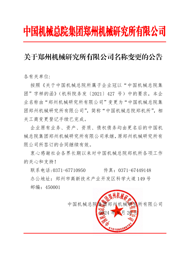 關于鄭州機械研究所有限公司名稱變更的公告