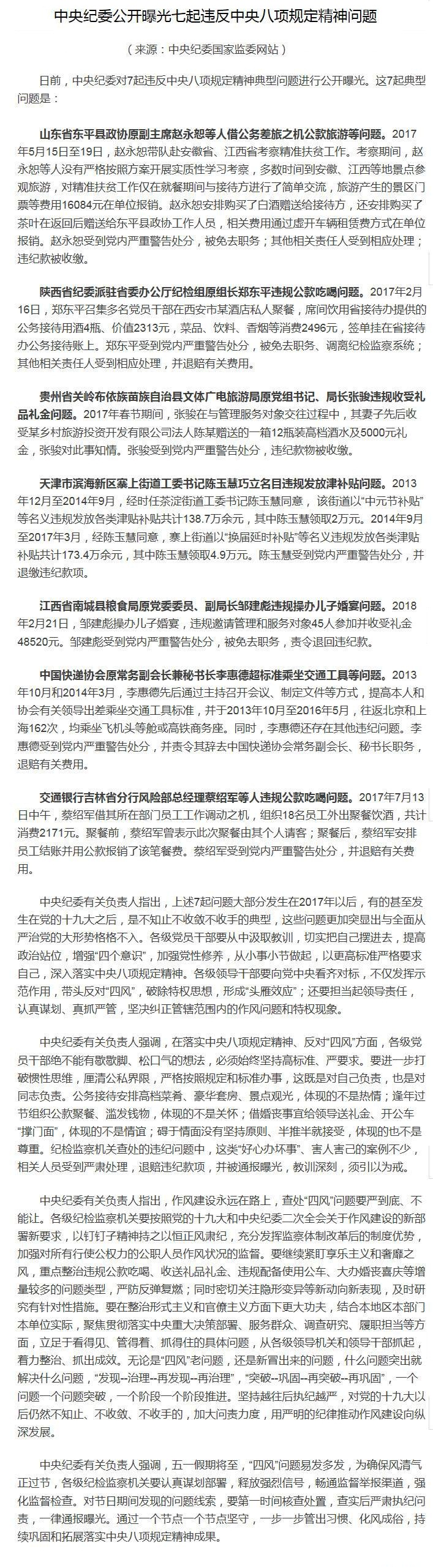 中央紀(jì)委公開(kāi)曝光七起違反中央八項(xiàng)規(guī)定精神問(wèn)題